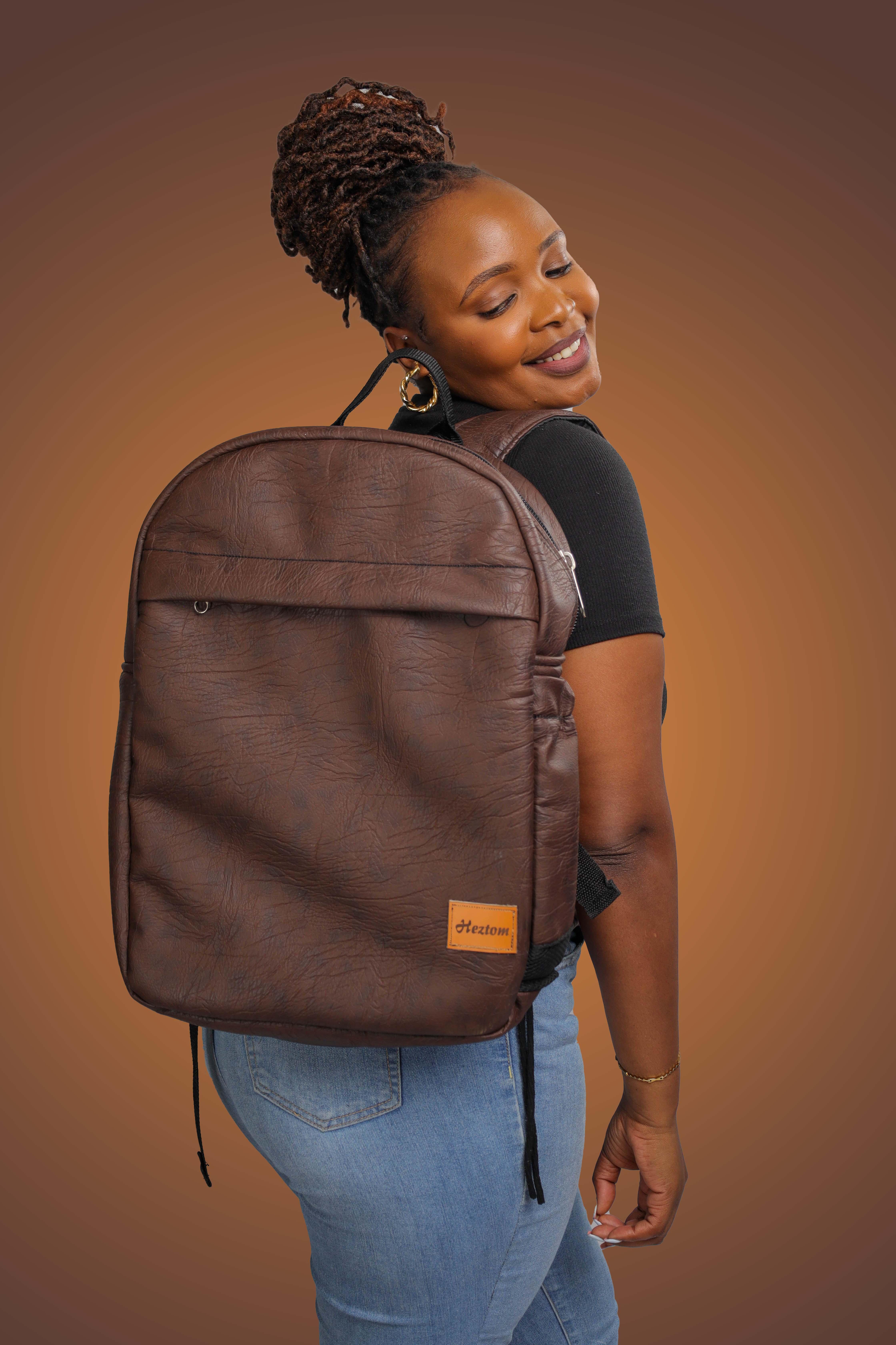 Leather backpack with laptop compartment.