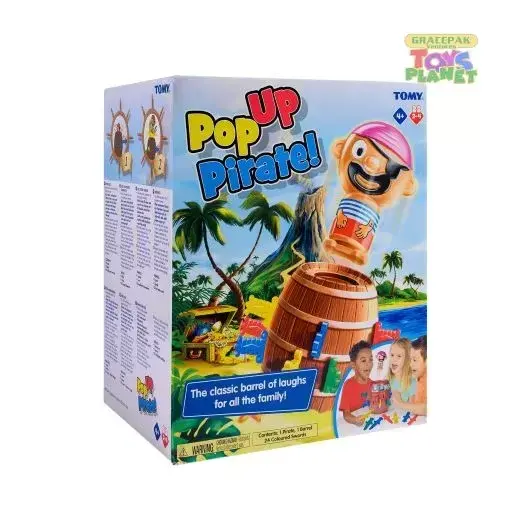 TOMY Pop Up Pirate is the classic kids? action board game for up to 4 players. Take turns sliding your swords into the barrel. There?s no knowing which one will send the pirate flying. Once you pop the pirate, you?re out! The remaining players remove their swords and push Pirate Pete back into his barrel ? completely resetting the pop function for more unpredictable fun. In the Pop Up Pirate board game, the last pirate standing wins. Will you be flying your Jolly Roger high? or walking the plank? Welcome aboard the classic children?s game of high sea adventures. The TOMY Pop Up Pirate board game encourages colour recognition and decision-making. And with Pete jumping free on a different slot at every game, the fun just keeps on popping.
