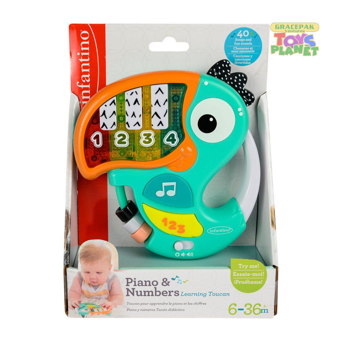 Piano & Numbers Learning Toucan is a fun partner to your child’s play times as they grow older and more curious and inquisitive as a result. This playful toucan has light-up piano keys that introduce little learners to music and numbers. The tail-feather handle is easy for little hands to grasp. Batteries are included. Comes in 2 modes:Intro to Music and Numbers and Mini Piano and Number Learning.