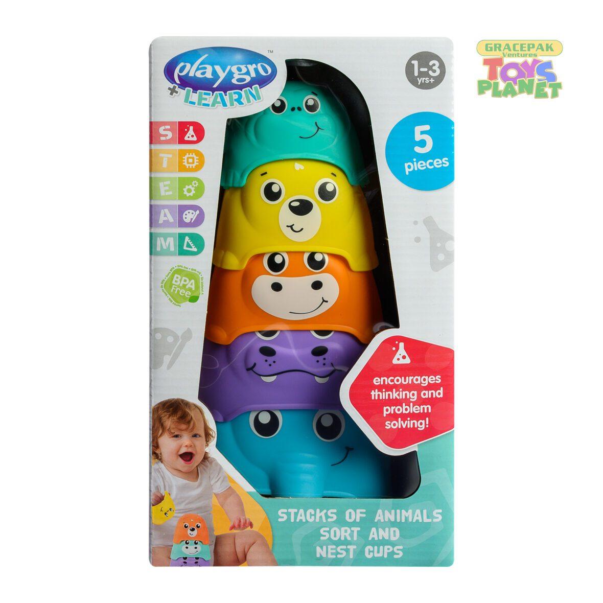 The Playgro Stacks of Animals Sort and Nest Cups is perfect for water play and safe to chew! The Chewy Stack and Nest Cups are bath time and water play essentials. Includes 4 colourful shaped cups for scooping, nesting, stacking and pouring. Patterned holes on the base allow water to drain from the cup and soft edges help soothes babies sore gums. Great for promoting baby’s motor skills, hand-eye coordination and cognitive thinking. *Stacking and nesting activities encourage baby to use their problem solving skills *Soft edges are perfect for baby to chew, soothing sore gums *Patterned holes in cups of base for pouring, draining and scooping *Various textures and edge details allow for tactile exploration *Bright colours contrast the water and stimulate visual sense