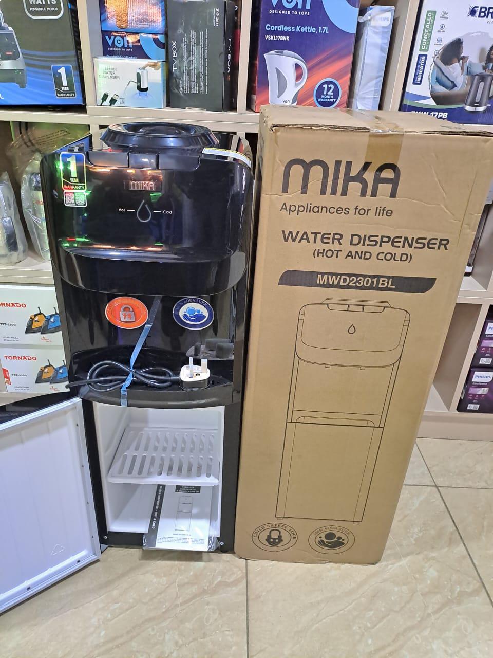 MIKA WATER DISPENSER HOT & COLD BLACK CHILD LOCK SAFETY PUSH BUTTON, CUP CABINET.